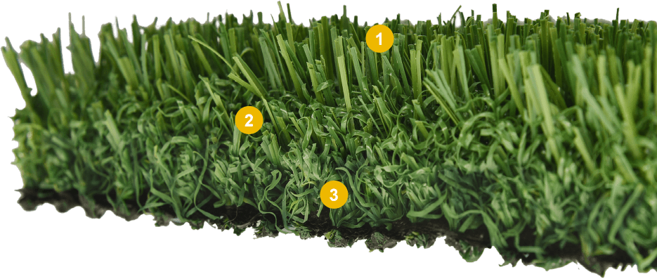 A multi-dimensional fiber design creates an ultra-dense, resilient playing surface, enhancing overall game quality. The strong, curly yarns provide stable and firm support by tightly winding and locking the straight yarns. This improves the standability of grass, enabling it to recover quickly after compression.